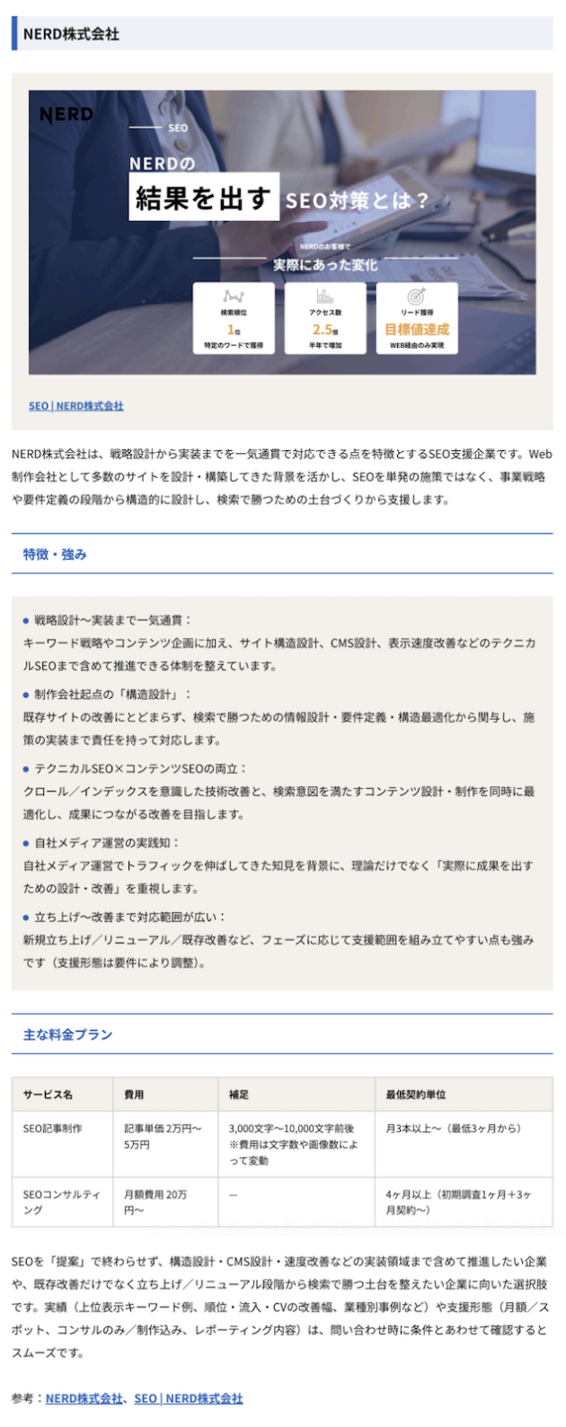 NERDのSEO支援は、戦略設計から実装・改善までを一気通貫で対応できる点を強みとしております。既存サイトの部分的な改善にとどまらず、検索結果で成果を出すための土台設計からご支援し、継続的な改善を通じて成果創出に取り組んでおります。