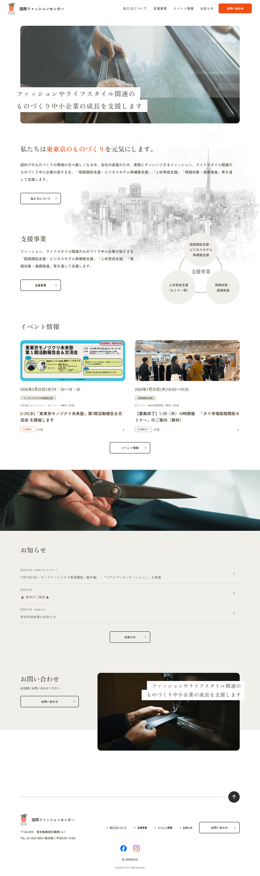 https://kfc-fashion.jp/国際ファッションセンター株式会社は、墨田区、東京都、国および民間企業を株主とする第三セクターとして設立された会社です。東京・墨田両国を拠点に、ファッションやライフスタイル関連のものづくり中小企業の成長支援を行っています。 この度、国際ファッションセンターのコーポレートサイトについて、NERDが制作いたしました。