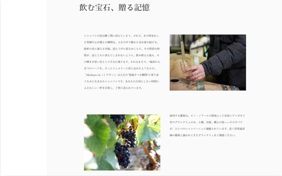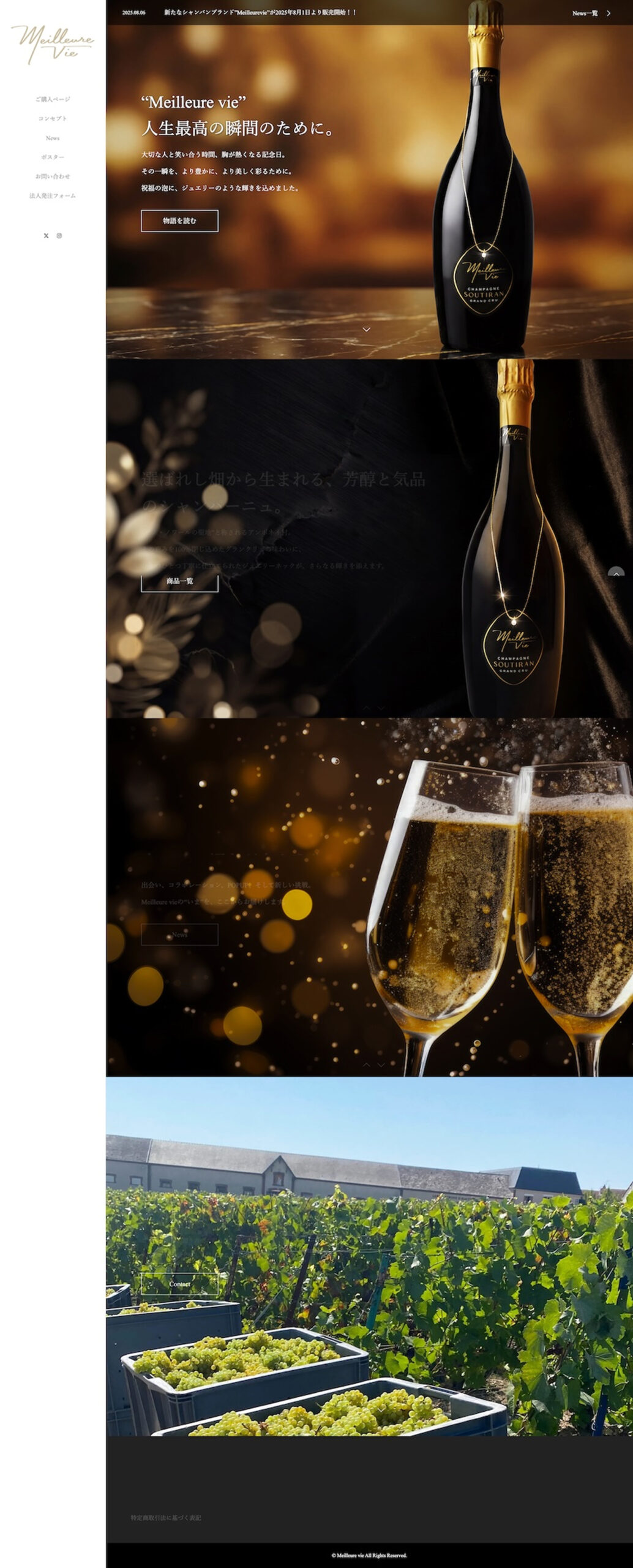 https://www.meilleurevie.co.jp/株式会社クロコラは、戦略コンサルティング・DX支援・デジタルマーケティングを軸に、企業の成長を実現する実行型ファームです。事業支援にとどまらず、自社でシャンパンの輸入代行・販売事業も展開しています。この度NERDでは、株式会社クロコラが運営するシャンパン輸入・販売ECサイト「Meilleure vie」の構築を担当いたしました。