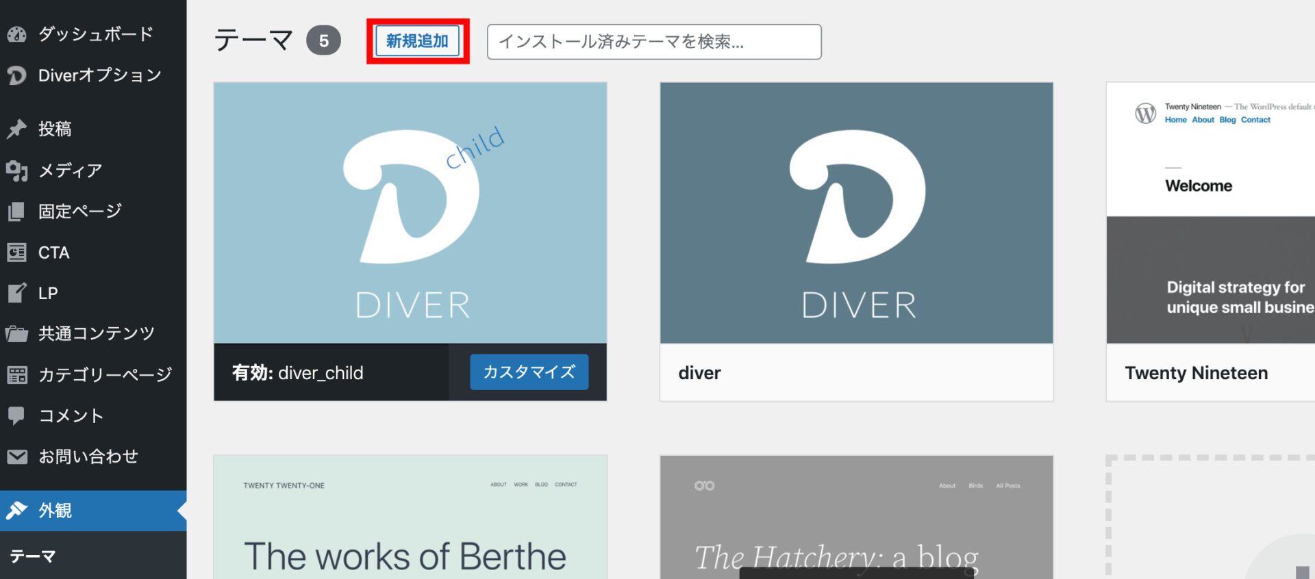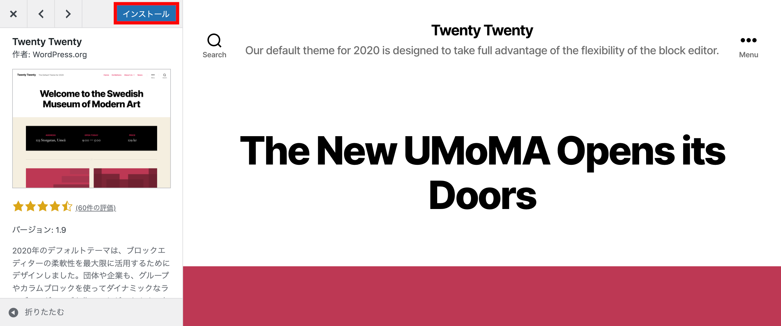 追加したいテーマを選択して該当テーマ画面の「インストール」をクリックすると、テーマが追加されます。