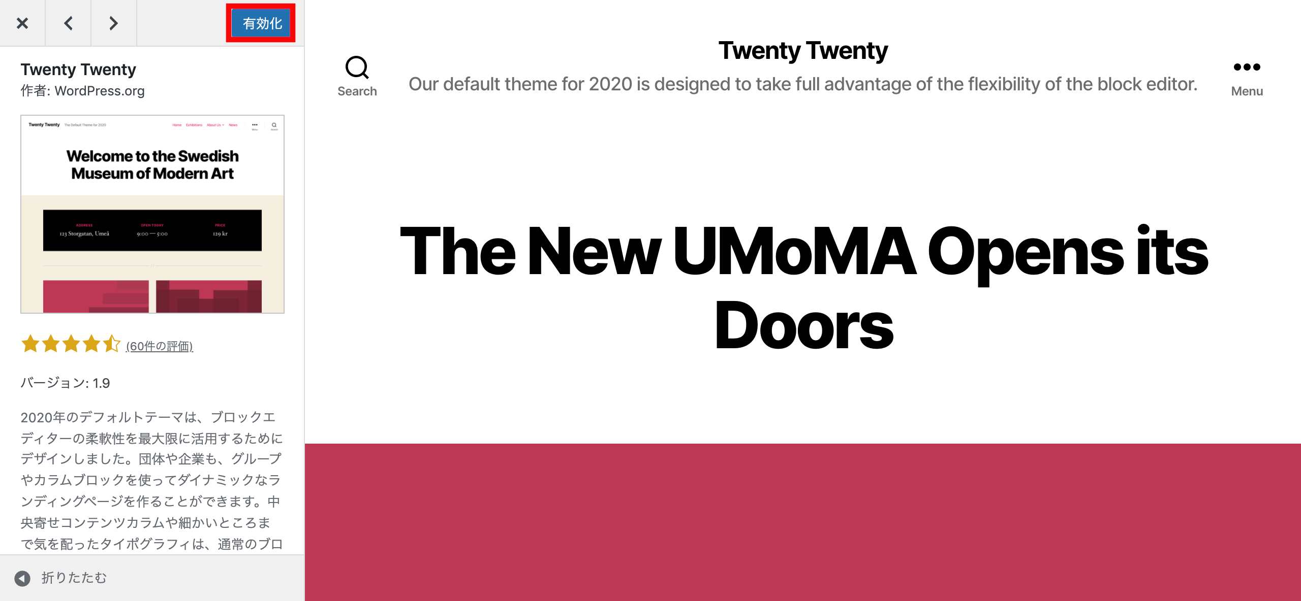 最後に「有効化」をクリックすると、ホームページにテーマのレイアウトが反映されます。