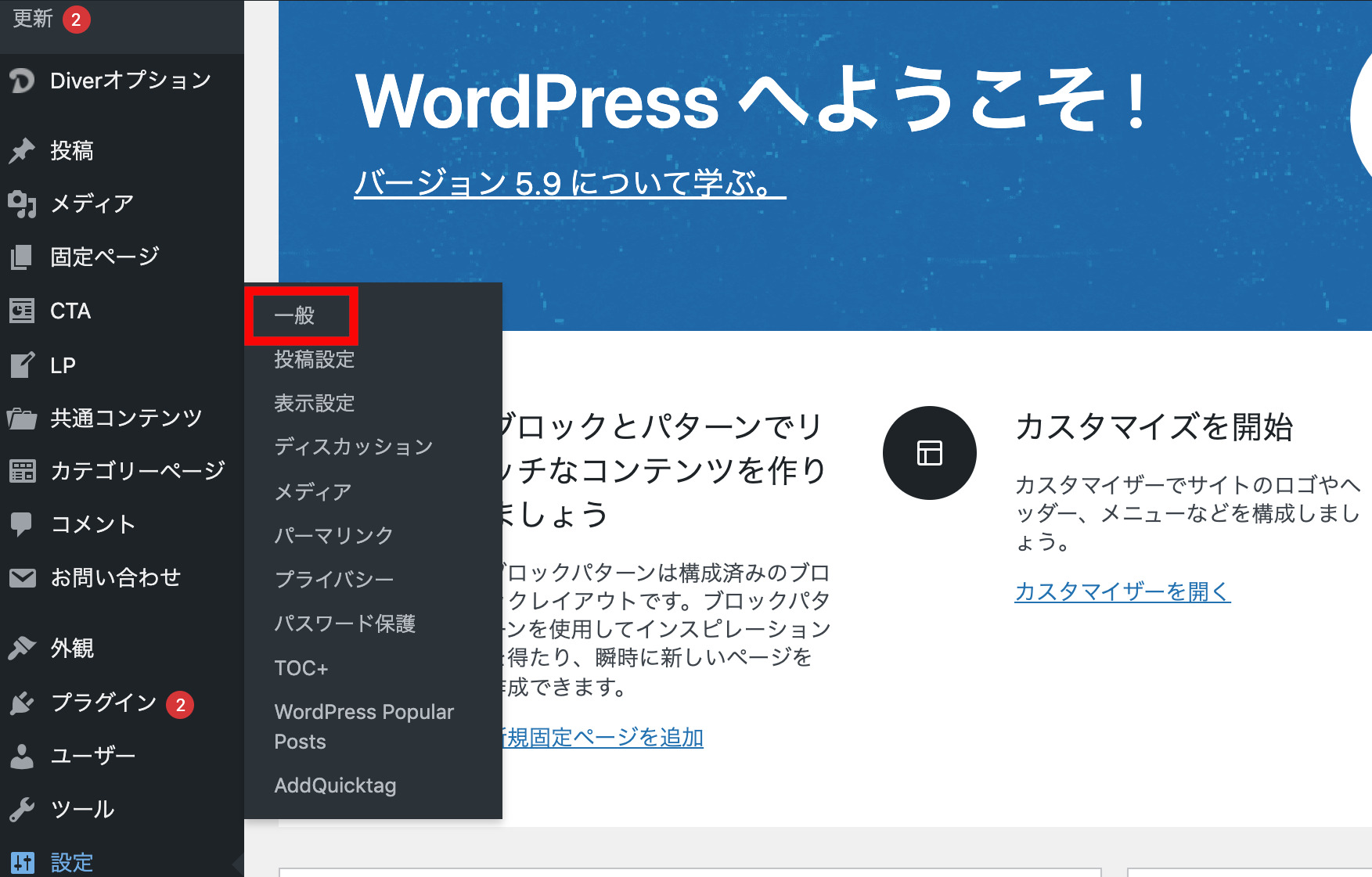 まず、ダッシュボードの「設定」から「一般」を選択します。