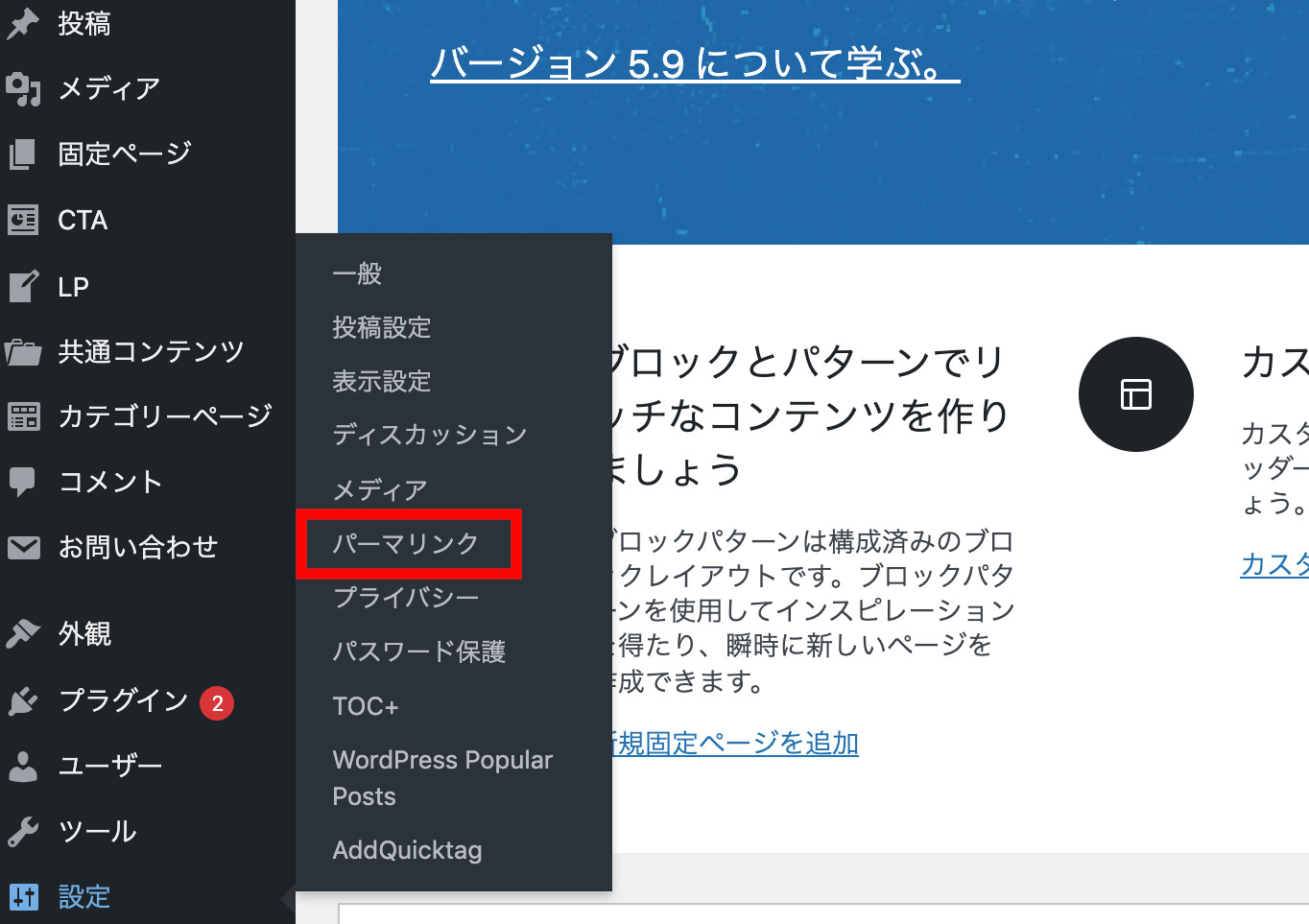 まず、メニューの「設定」から「パーマリンク」を選択します。