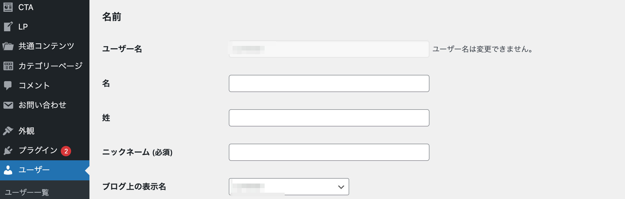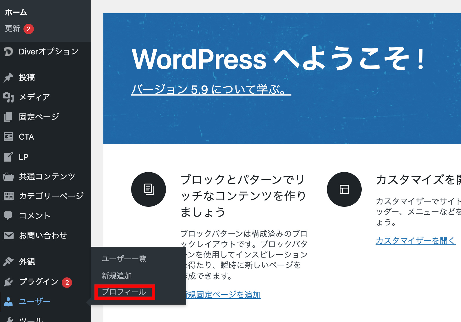 まず、メニューの「ユーザー」から「プロフィール」を選択します。