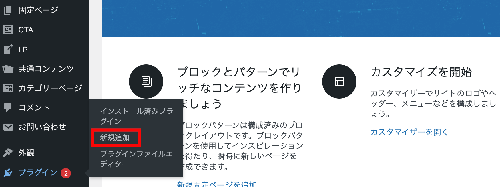 まずメニューから「プラグイン」を選択し、「新規追加」をクリックします。