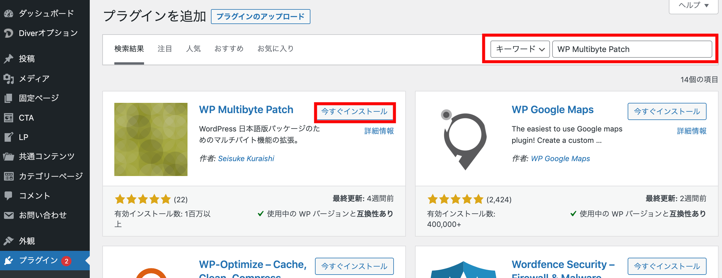 画面右上の検索フォームに「WP Multibyte Patch」と入力し、表示されたら「今すぐインストール」をクリックします。