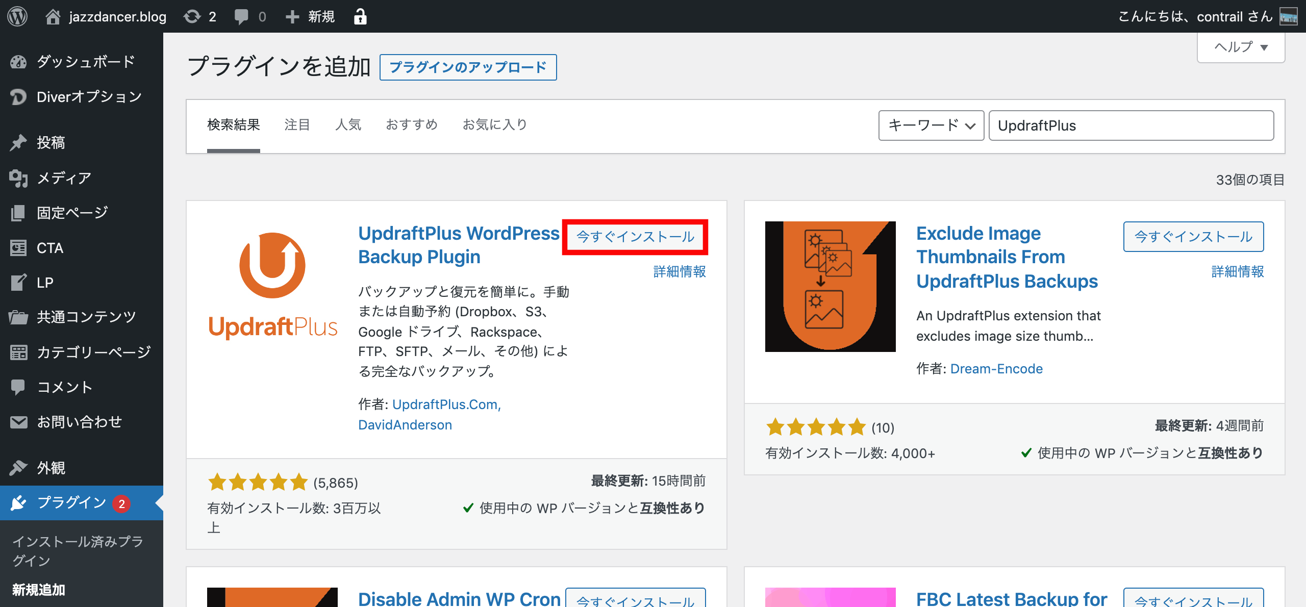 まずは、プラグインの新規追加画面から「UpdraftPlus」のインストールを行いましょう。