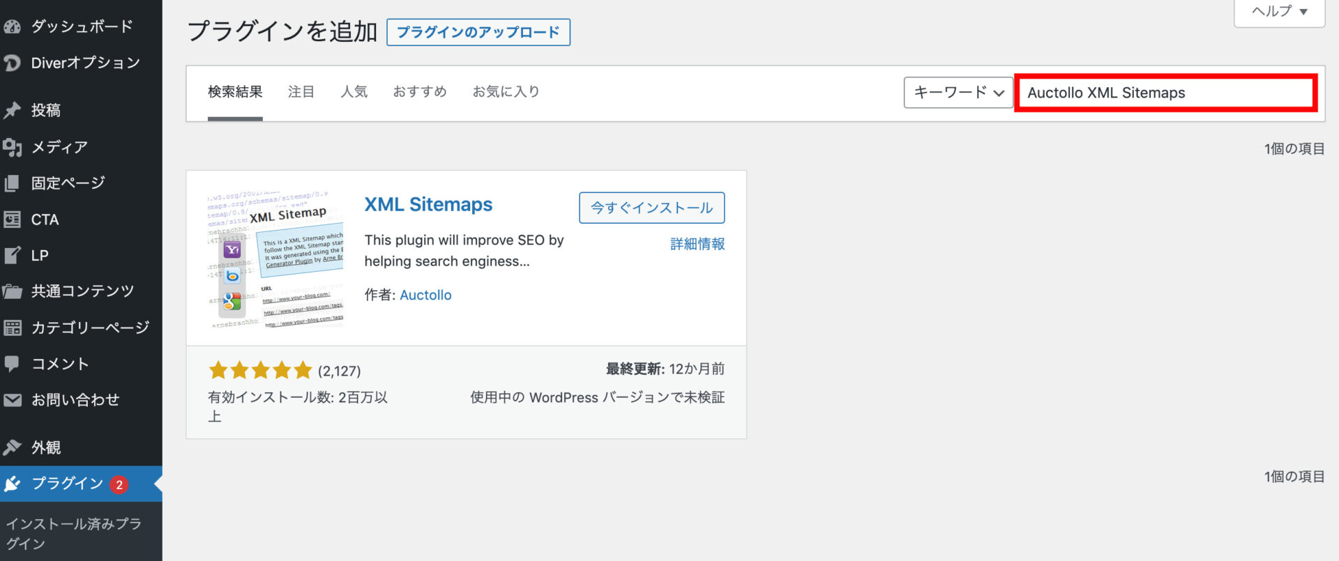 「XML Sitemaps」だけではプラグインが見つからない場合もあるので、作者名も追加して「Auctollo XML Sitemaps」と検索してみましょう。インストール後は、プラグインを有効化してください。