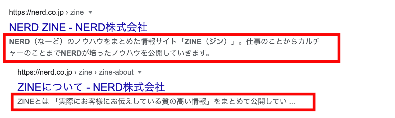 そしてdescriptionタグは、検索結果一覧で該当ページの説明文や要約文を表示するタグです。