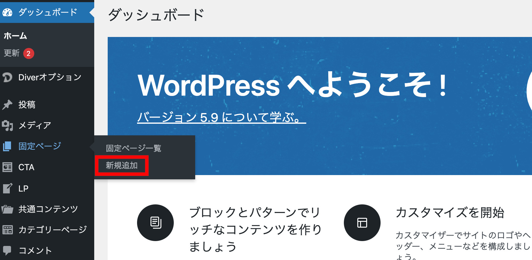 固定ページは、ダッシュボードのメニュー「固定ページ」から「新規追加」をクリックすることで簡単に作成可能です。