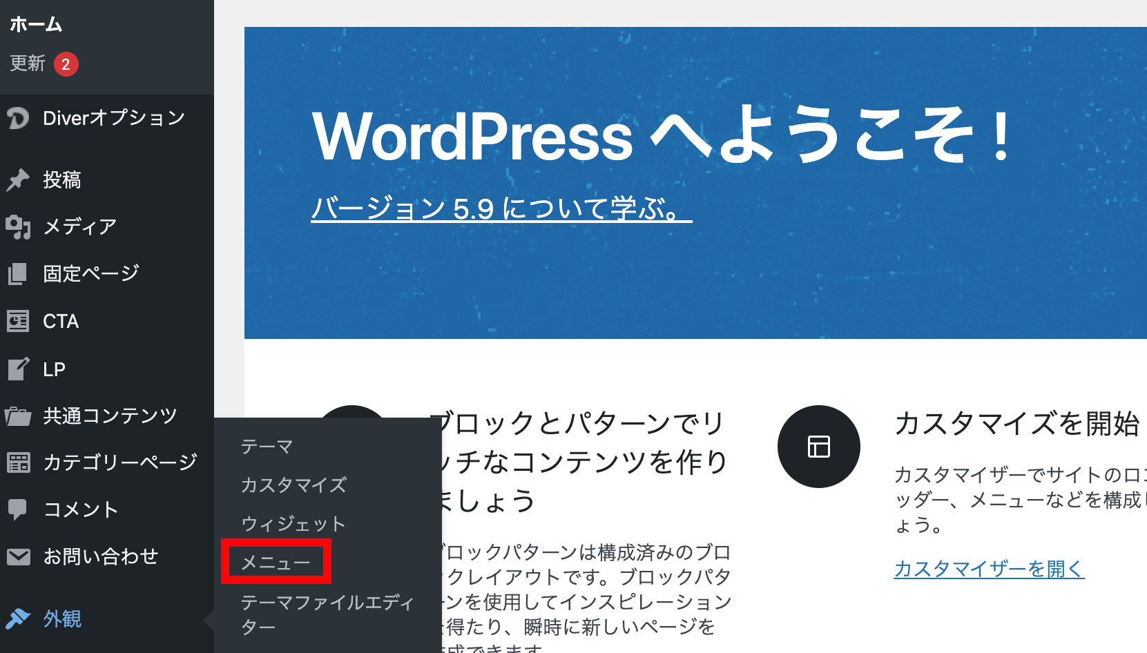 メニューに追加する項目は、ダッシュボードのメニュー「外観」から「メニュー」をクリックすると設定できます。
